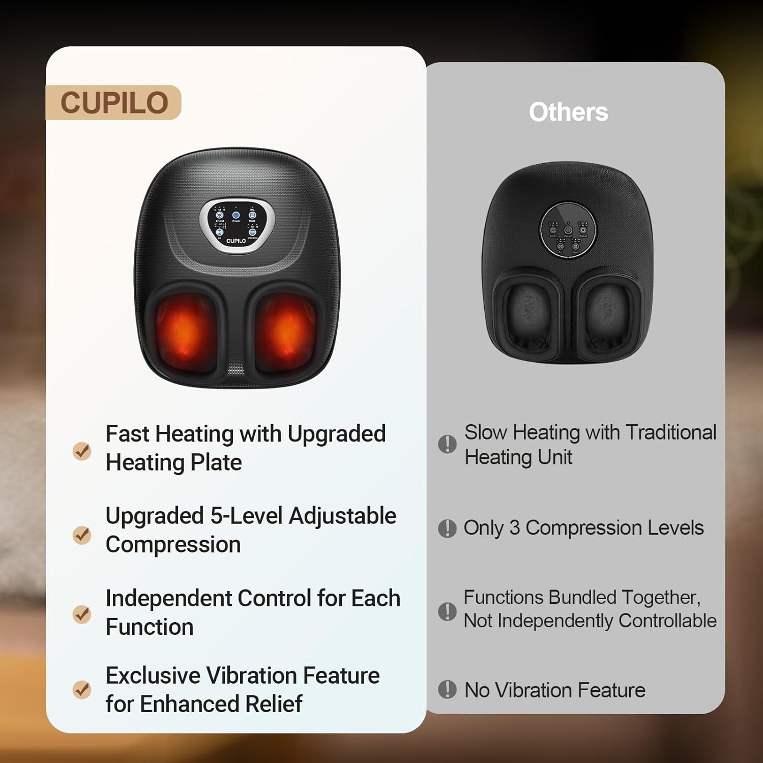 CuPiLo Shiatsu Foot Massager combines rolling/kneading, quick heating, compression, and vibration functions to alleviate pressure and address various foot issues.