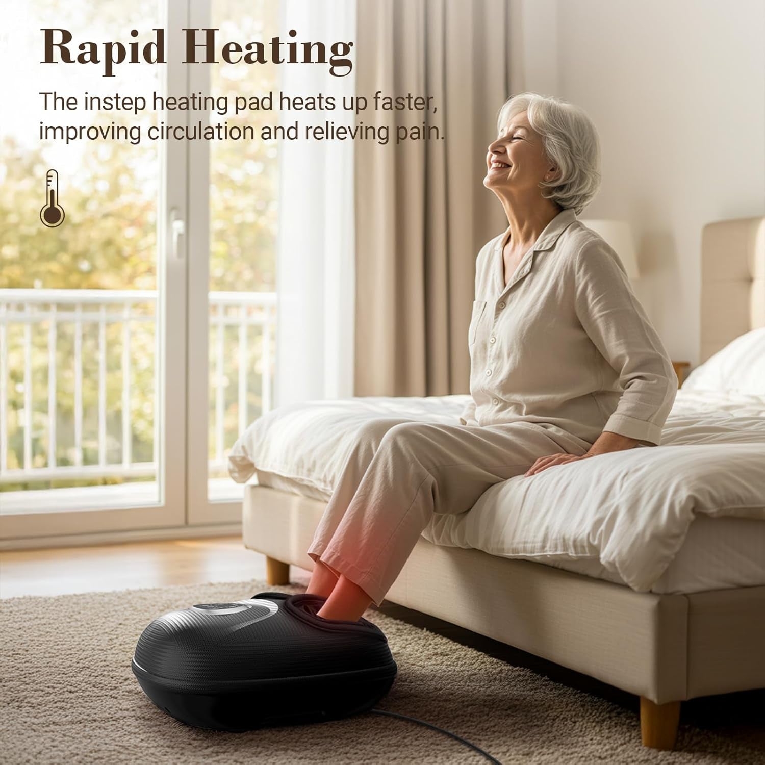 - Fast Heating & Safe Use: The foot massager with heat delivers soothing warmth to cold, stiff feet, making it an excellent foot heater or foot warmer. It helps ease foot fatigue and soreness, promotes circulation, and improves sleep quality. Adjustable heat settings (113–131°F) and built-in overheating protection with auto shut-off ensure a safe and worry-free massage experience.